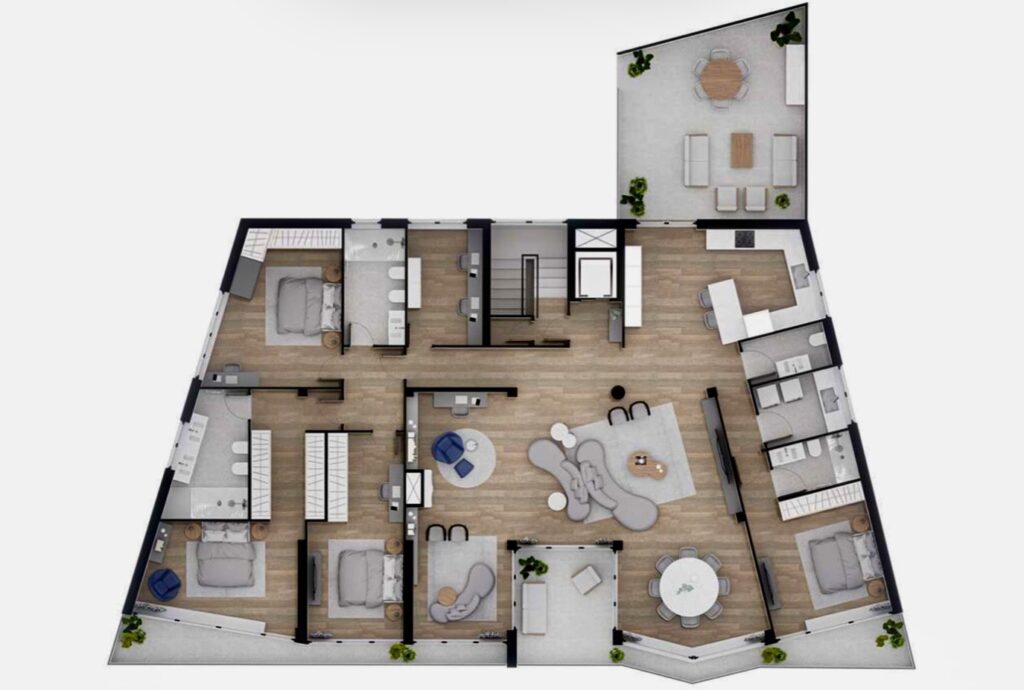 L’appartamento, con architettura moderna e lineare, si sviluppa su un unico piano e dispone di un ascensore che garantisce un comodo accesso privato. Gli ambienti interni sono progettati per massimizzare lo spazio e la luminosità, creando un’atmosfera accogliente e rilassante. Le terrazze, che circondano l’attico, offrono uno spazio esterno ideale per godersi il panorama straordinario e momenti di relax.