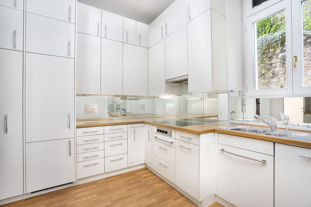 • Cucina completamente attrezzata con elettrodomestici di ultima generazione e finiture bianche.