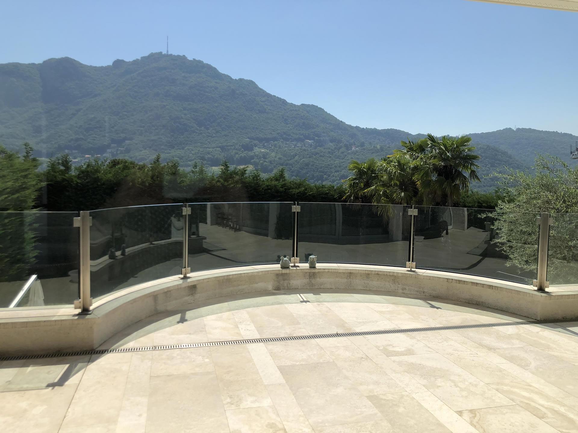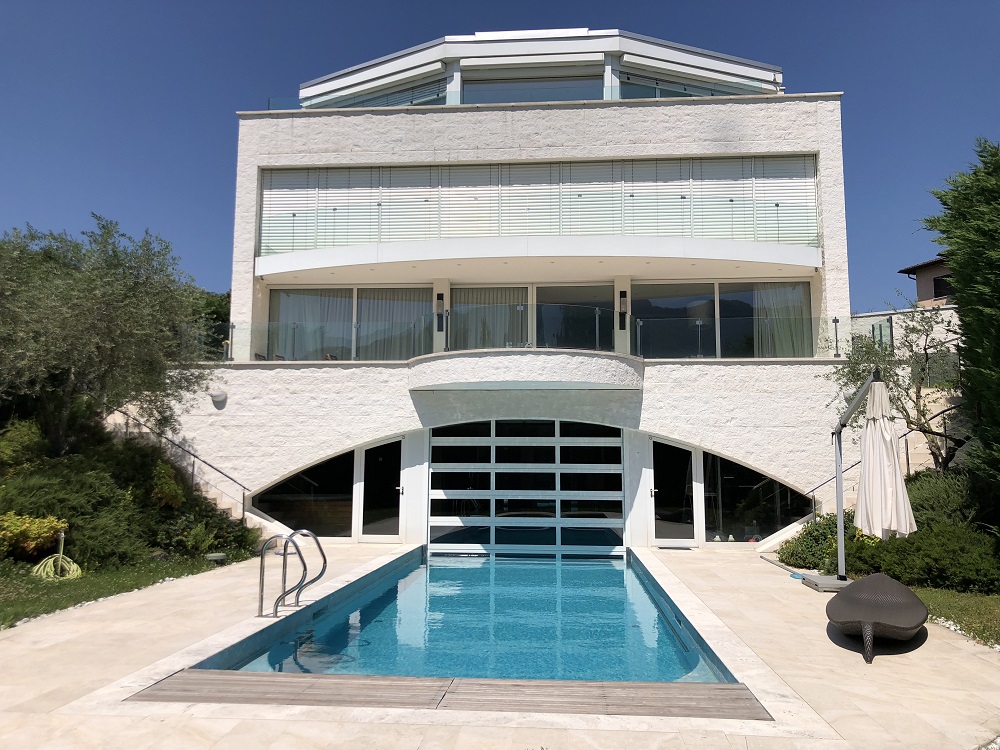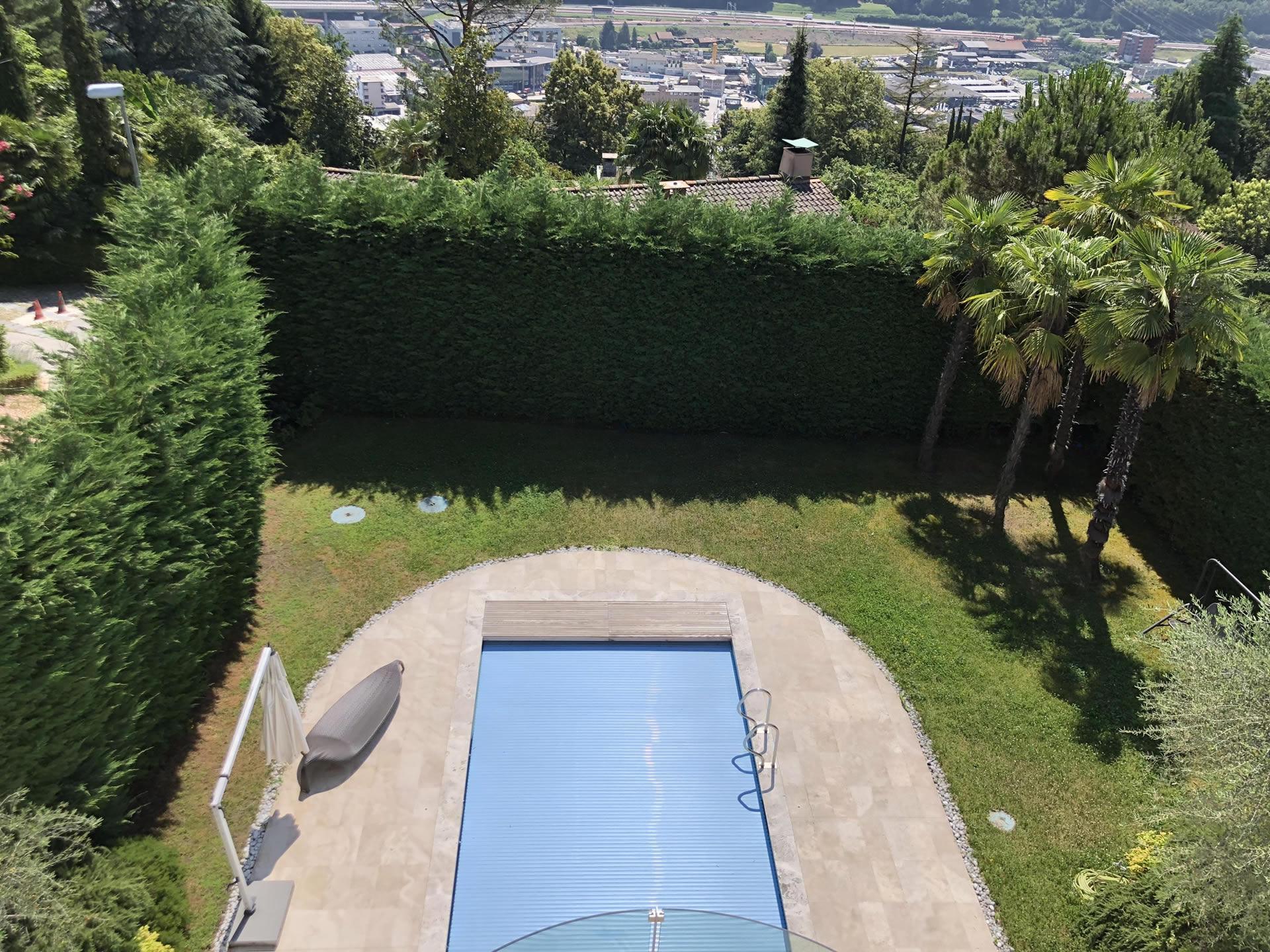 La villa di prestigio con piscina a Montagnola si sviluppa su tre piani fuori terra e un piano seminterrato, leggermente sporgente, nel quale è collocata la piscina interna/esterna.